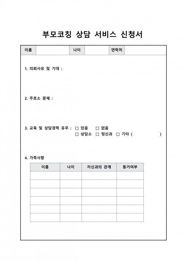 1. 「부모코칭상담서비스신청서」양식을 다운받으신 후 프린트로 출력합니다.
